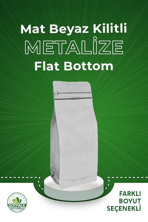 Mat Beyaz Kilitli Metalize Flat Bottom 3 katlı yapısı ile hava, nem ve ışık gibi etkendere karşı içinde bulunan ürünü muhafaza eder ve raf ömrünün uzun olmasını sağlar.